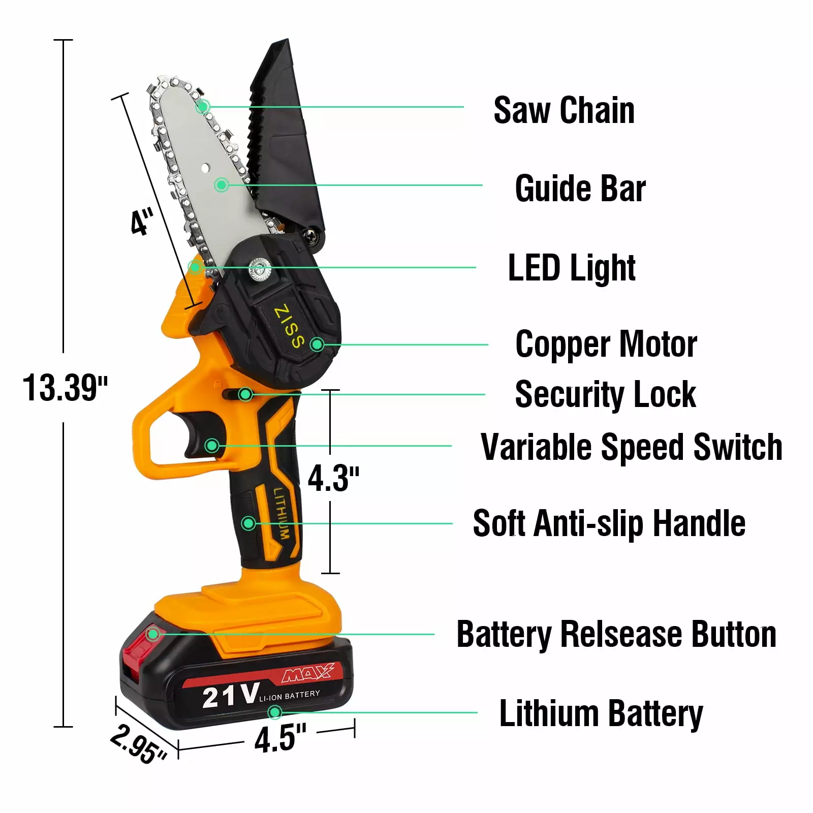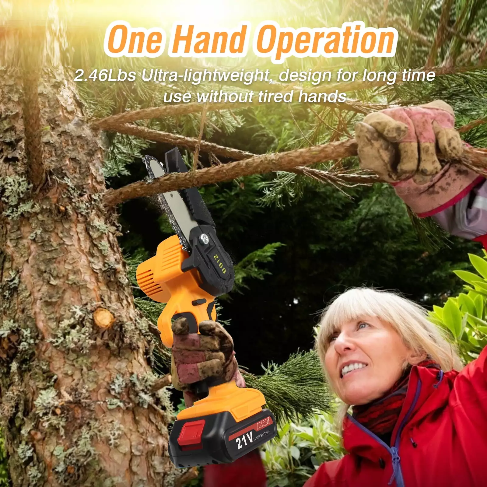 Ziss 21V Mini Cordless Chainsaw has an ergonomic and lightweight design with high performance. making it a perfect tool for farm. garden. home use. Built-in pure copper motor. 550W strong power. fast cutting. lower machine noise. optimizes battery energy use. This electric saw is very suitable for wood cutting. frestry harvesting. tree pruning. gardening. a great helper for any gardening job.