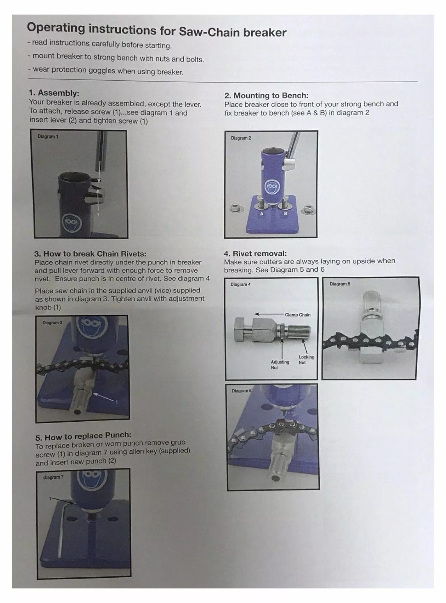 ByEUcuk Professional Steel Chain Breaker. is ruggedly built for years of reliable service. It’s smooth cam action is specially designed for optimum leverage. providing fast and easy chain breaking. The breaker includes adjustable anvil for all size chains. allen wrench. punch for 14"-12" pitch chains. small punch for .043 gauge narrow-kerf chains and operator instruction manual. Service Tip: When breaking saw chain always be sure your punch is exactly centered over the rivet you are punching out or you will break your punch.ByEUcuk Chainsaw Saw Steel Chain Breaker Repair Tool Professional Bench Mounted