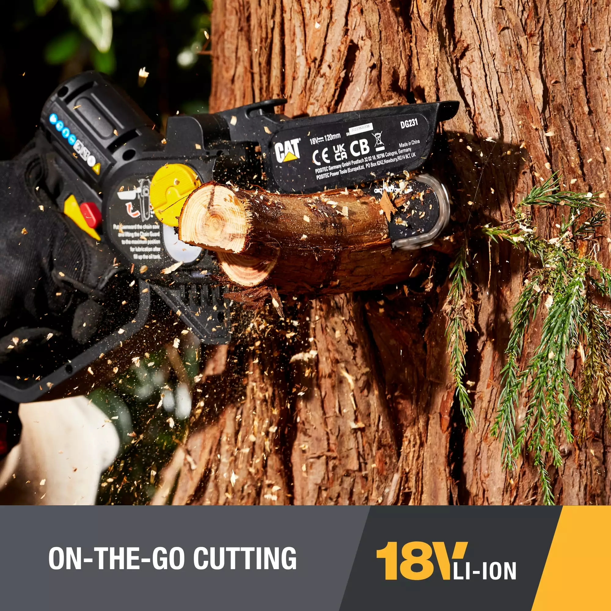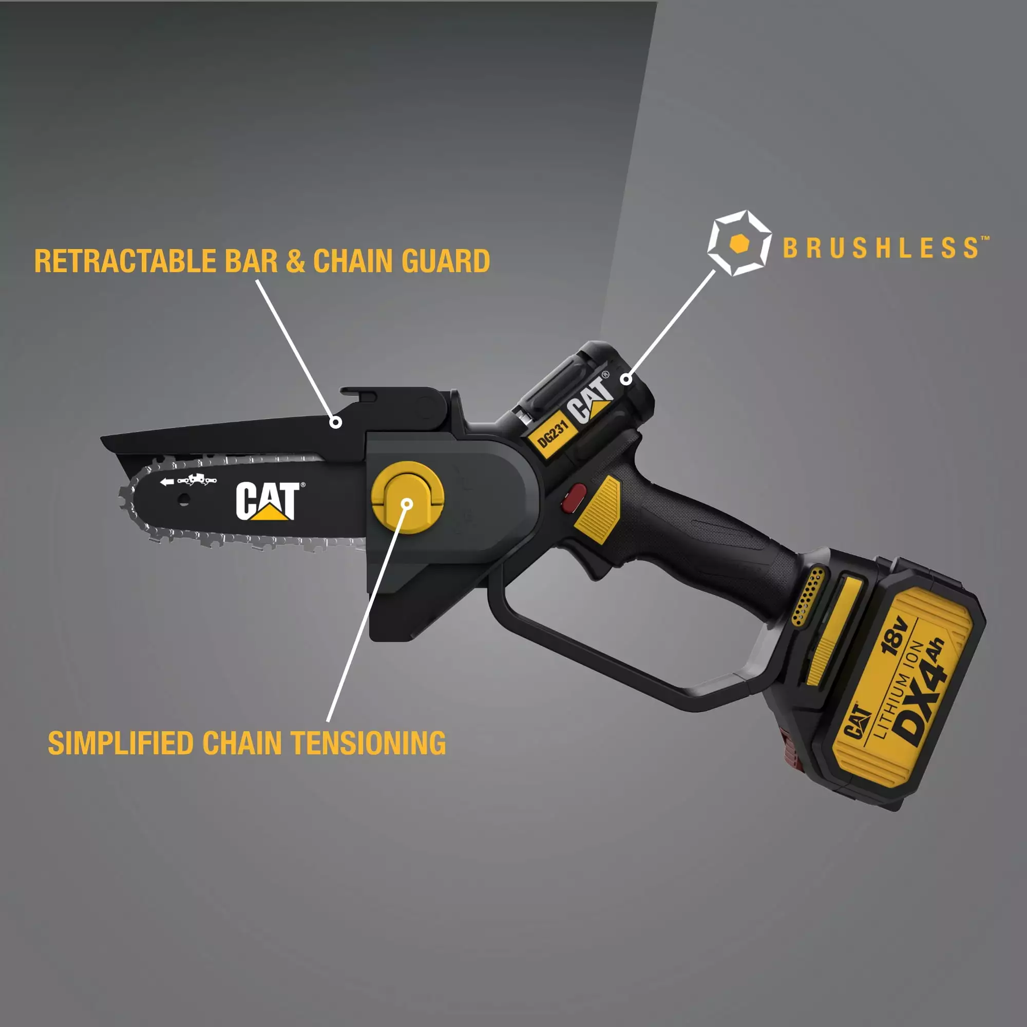 The CAT® DG231 18V Brushless 5 Cordless Pruning Saw uses advanced technology and design to enhance power and performance for a wide range of cutting and trimming tasks. Built with a High-Efficiency Brushless Motor. this cordless pruning saw delivers 25% more power. 50% longer run time. and 10X longer life than brushed-motor alternatives. Featuring an ultra-compact and lightweight design. this 4.1-lb. pruning saw is incredibly easy to maneuver and comfortable to carry. This enhanced portability makes the DG231 ideal for a variety of on-the-go cutting applications such as bucking firewood at a campsite. clearing brush on a hunting trail. maintaining large properties. and much more. The 5 bar length is also sized to take on a several everyday cutting jobs such as pruning and removing branches. delimbing felled trees. and quickly trimming shrubs. Automatic Chain Tensioning is made possible by a spring-loaded system that achieves the perfect tension for every cut you never have to worry about making adjustments. The pruning saw’s Onboard Chain Lubrication capability also makes it easier to oil the chain so you can enjoy consistently smooth performance. prevent wear. and save time on maintenance. In addition to being more manageable than a standard-sized chainsaw. the 18V cordless pruning saw is optimized for safety. For example. the Retractable Bar and Chain Guard offers protection from the blade but remains easy to adjust during operation. When cutting from above. the retractable guard will automatically pull back. The guard can also be manually retracted to support undercutting. The saw also is equipped with a Guarded Handle Design to increase safety and security during operation. Power the pruning saw with any battery that’s part of the Cat® 1 For All platform including the 2.0Ah Li-Ion. 4.0Ah Li-Ion. or 5.0Ah Graphene models. For optimal performance and run time. choose the 5.0Ah Graphene battery over lithium-ion options. The 1 For ALL battery platform is a rechargeable. interchangeable system that supports all tools within the expansive 18V cordless product line from Cat®.