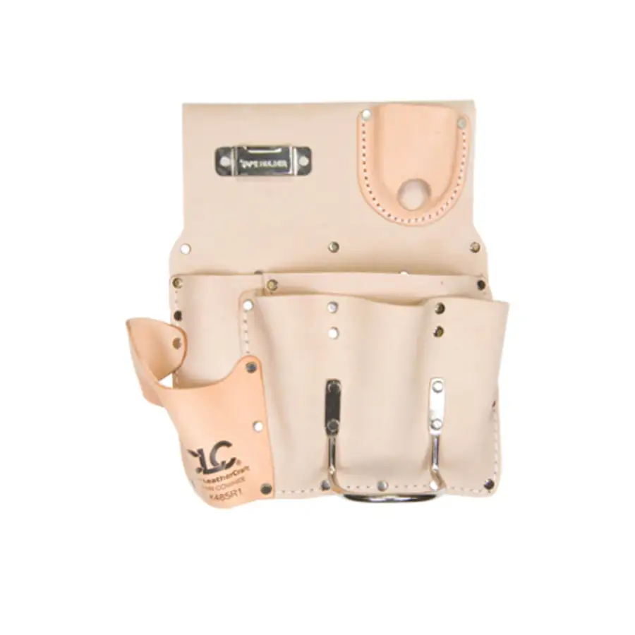 A premium quality. leather drywaller’s pouch with 7 pockets. including a sharpening stone holder. drywall saw sleeve. a hammer loop. and a tape measure clip.