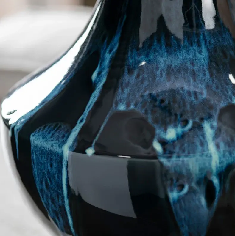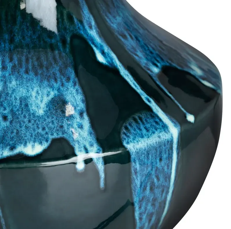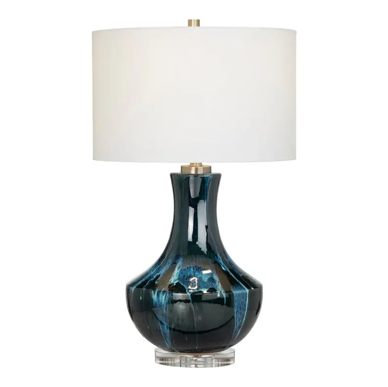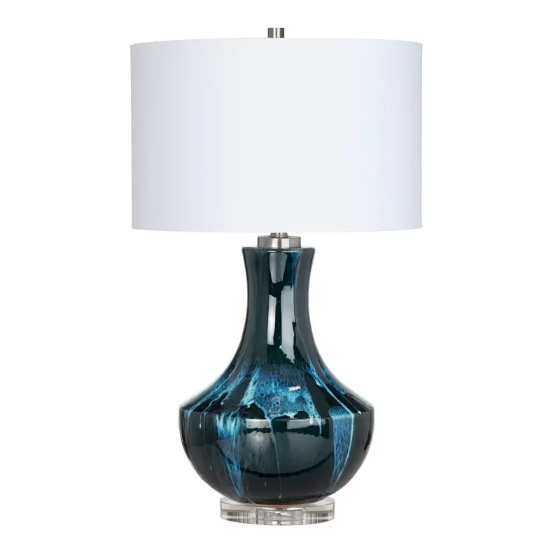 The Maya Table Lamp by Crestview Collection showcases the mastery of skilled ceramists. This vase shaped piece with its rich cobalt reactive glaze exhibits both depth and shine. It is mounted on a crystal vase for added sophistication and topped with a white flax shade.