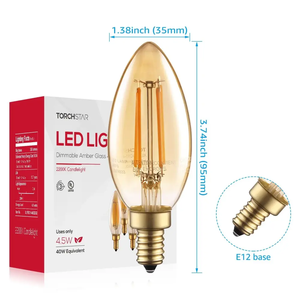The Vintage Dimmable LED is a 4.5W, energy-efficient chandelier bulb designed with an amber glass shade emitting a snug 2200K glow, optimal for cozy ambiances in homes.