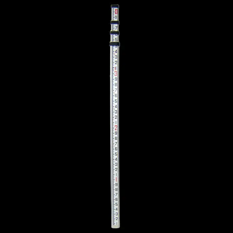 Durable aluminum construction with protective anodized finish. Telescoping rod for easy storage. Dual graduations read engineers scale feet/lengths on front and standard feet/inches on back. Snap on circular leveling vial included and nylon carrying bag with shoulder strap.