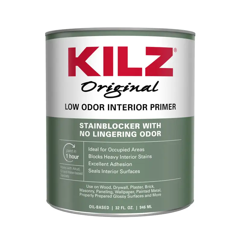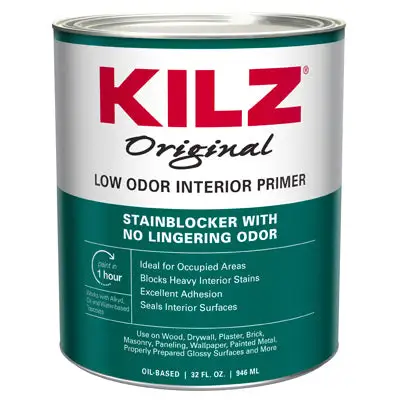 Kilz Odorless. QT. White Oil Base. Low Odor Stain Blocking Primer/Sealer. Interior Use. Fast Dry. White Pigmented Primer For Wood. Drywall. Plaster & Burned Areas. Holds Back Water Stains. Pen. Lipstick. Crayon. Grease & Oil Stains. Previously Called