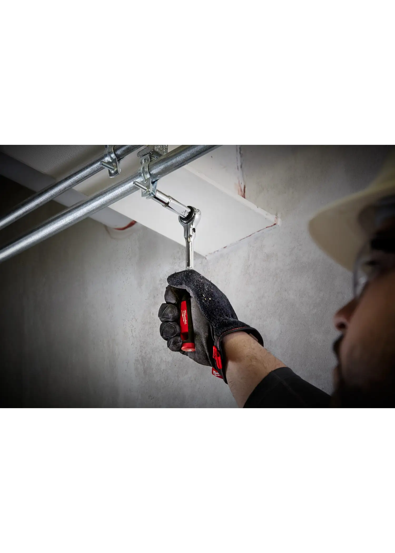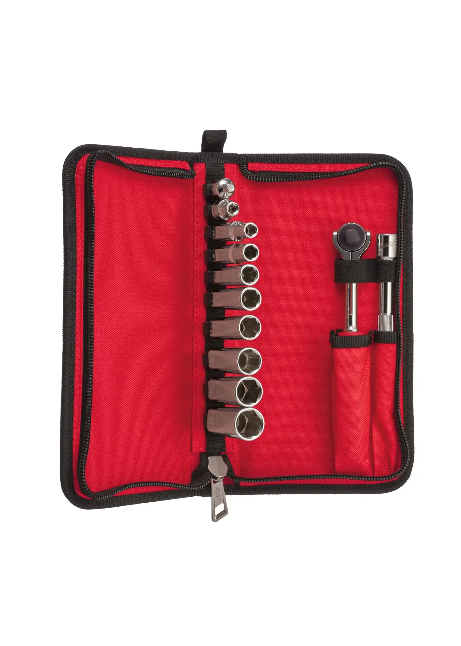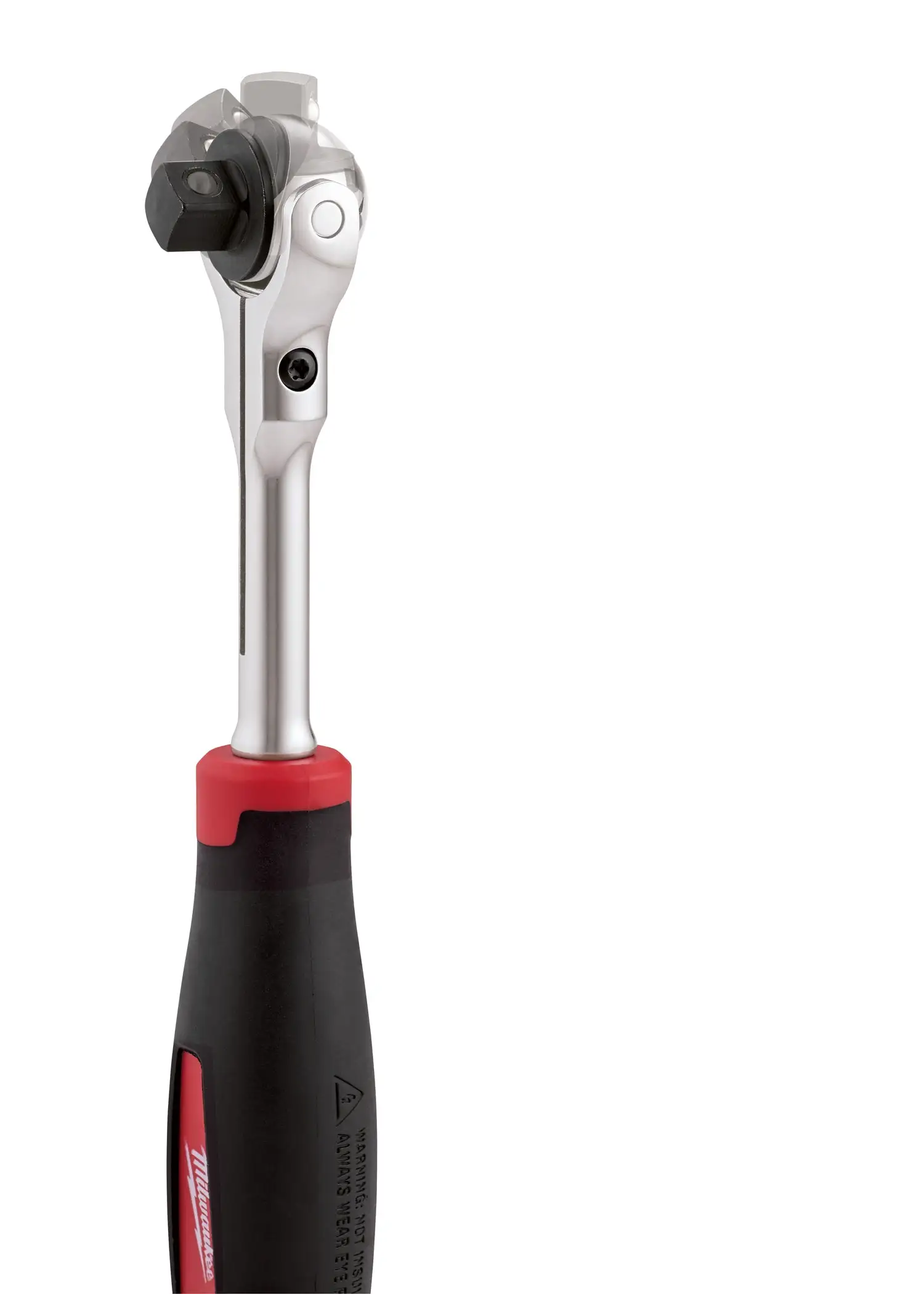 The MILWAUKEE 12 piece 3/8 Drive SAE Ratchet Set delivers ultimate versatility and access. FOUR FLAT Sides are anti-roll and wrench-ready. The slim-profile ratchet has a pivoting ratchet head so it can be used as a ratchet. a nut driver. or any angle in between. SAE socket sizes are stamped into the flats for improved visibility and easy reference. The ratchet wrench kit is stored in a soft-sided carrying case that includes a socket rail to keep sockets and accessories organized.