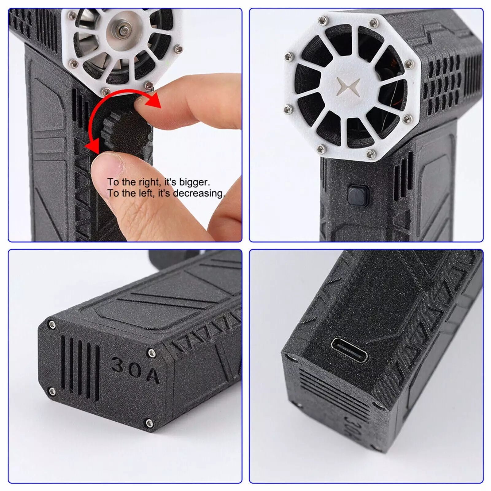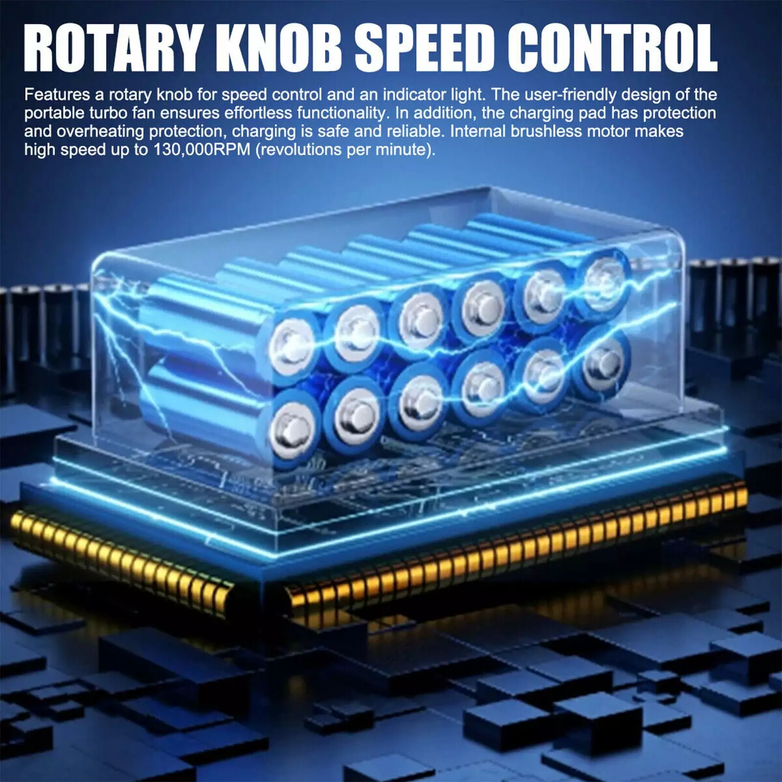 - Built-in 13 large-size blades. which is made by precise machining. highest efficiency and longest durability.Support infinite speed regulation function. press and hold the button to adjust the wind speed. release the button to stop.