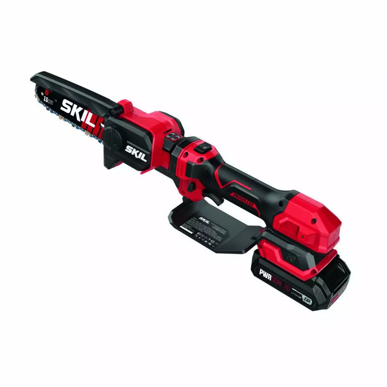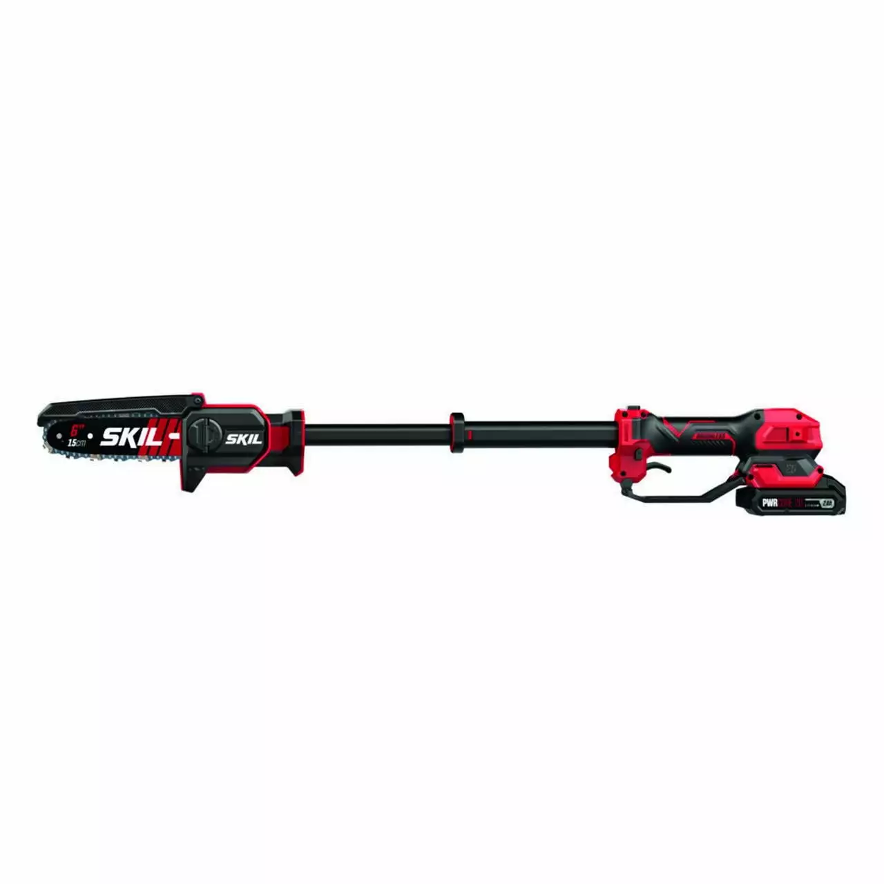 Reach for the SKIL PWR CORE 20 Brushless 20V 6 In. Telescopic Pruning Saw for light-duty pruning needs. The cordless pruning saw is equipped with a 6-inch bar and chain. and its pole extends up to 2.8 feet in total length for up to 7 feet of cutting reach. Its compact and lightweight profile delivers maximum cutting versatility. Its powerful brushless motor delivers up to 115 cuts per charge with the included PWR CORE 20 2.0Ah battery. Tool-free chain tensioning allows chain adjustments with the simple twist of a dial. Its chain auto lubricates for reduced friction and enhanced durability. IPX4 water resistance adds durability for use in inclement weather. It comes with an EASYSTORAGE bracket to conveniently store and organize all your SKIL PWR CORE 20 outdoor power equipment. The kit includes the 6-inch cordless telescopic pruning saw. PWR CORE 20 2.0Ah battery. and PWR CORE 20 20V Standard Charger.