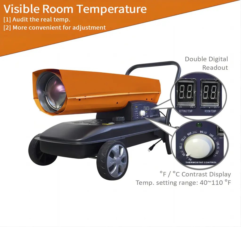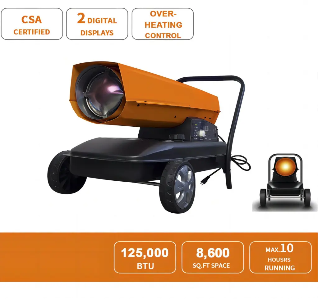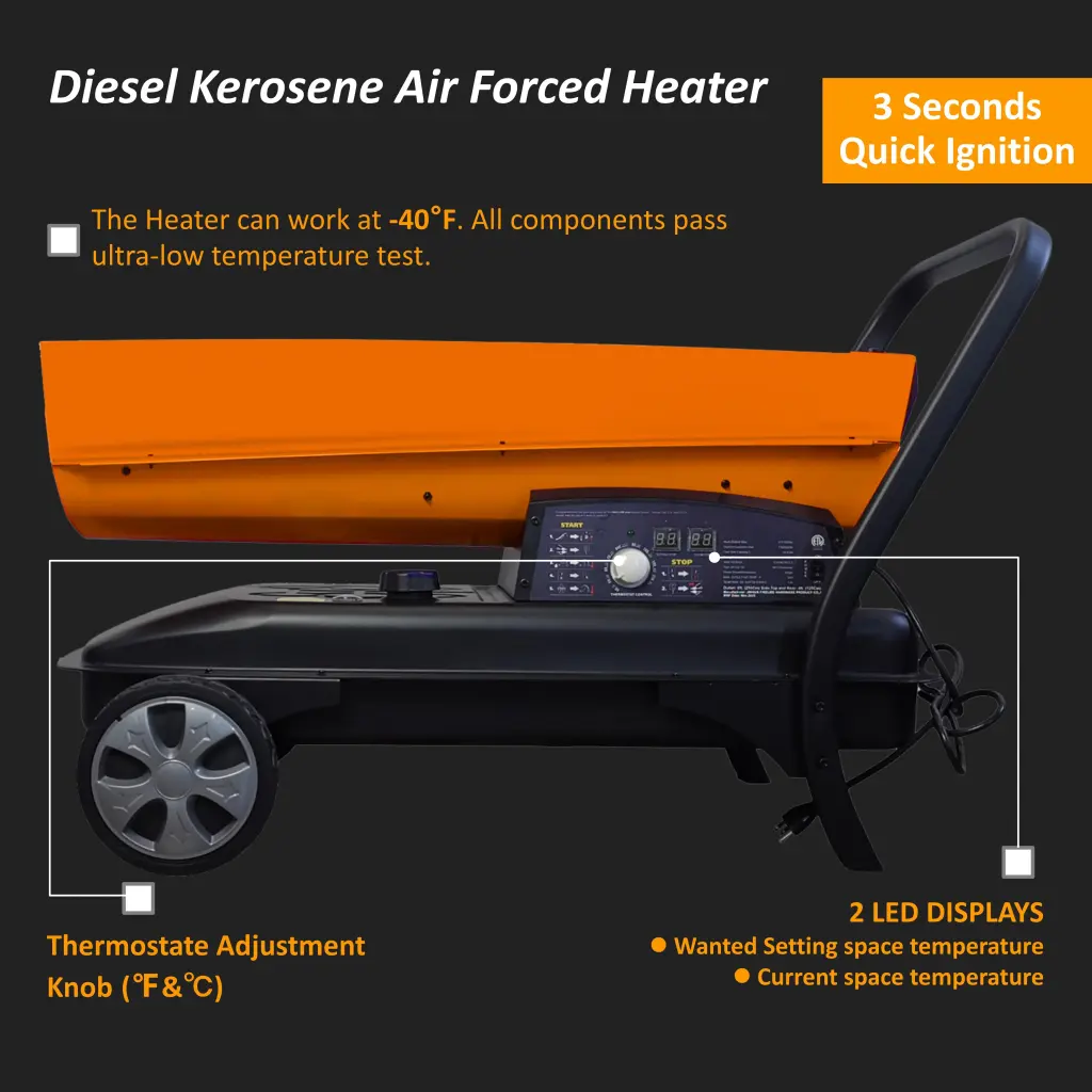 Travel-friendly Movable Torpedo Forced Air Heavy Duty 125000btu Kerosene/Diesel Heater with Thermostat Regulation and Overheat Preserveion for Jobsite,Garage,Construction Site and Farm. Characteristics: [HIGH Output Heating] The GarLUGH heater outputs Max.125000 BTUs of heat for spaces up to 8500 square feet. [EXTREME Worki