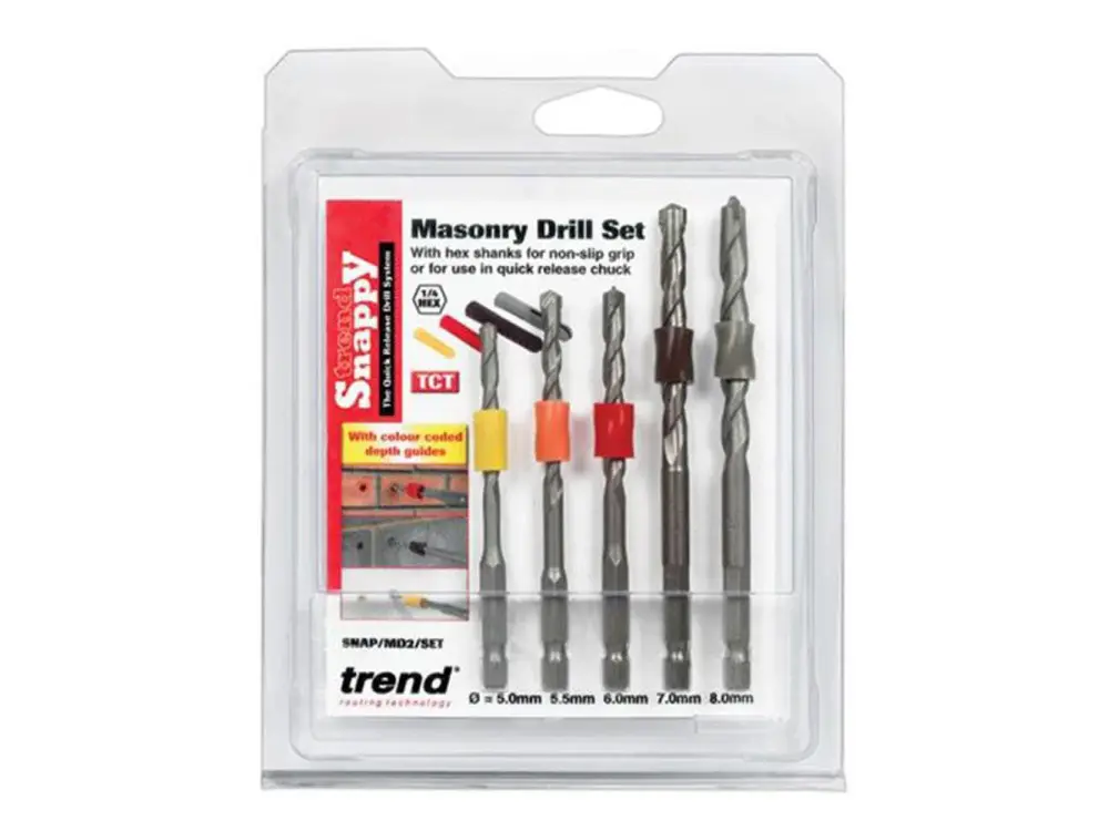 The Trend 5 Piece Snappy Depth Band Masonry Drill Bit Set assembled for drilling into plaster walls, plasterboard, mortar, brick and building blocks. Colour bands on these drills allow easy selection of the wall plug and allow for setting of drilling depth to suit wall plug.Contains: 5mm drill with yellow band, 5.5mm drill with orange band, 6mm drill with red band, 7mm drill with brown band and 8mm drill with grey band.