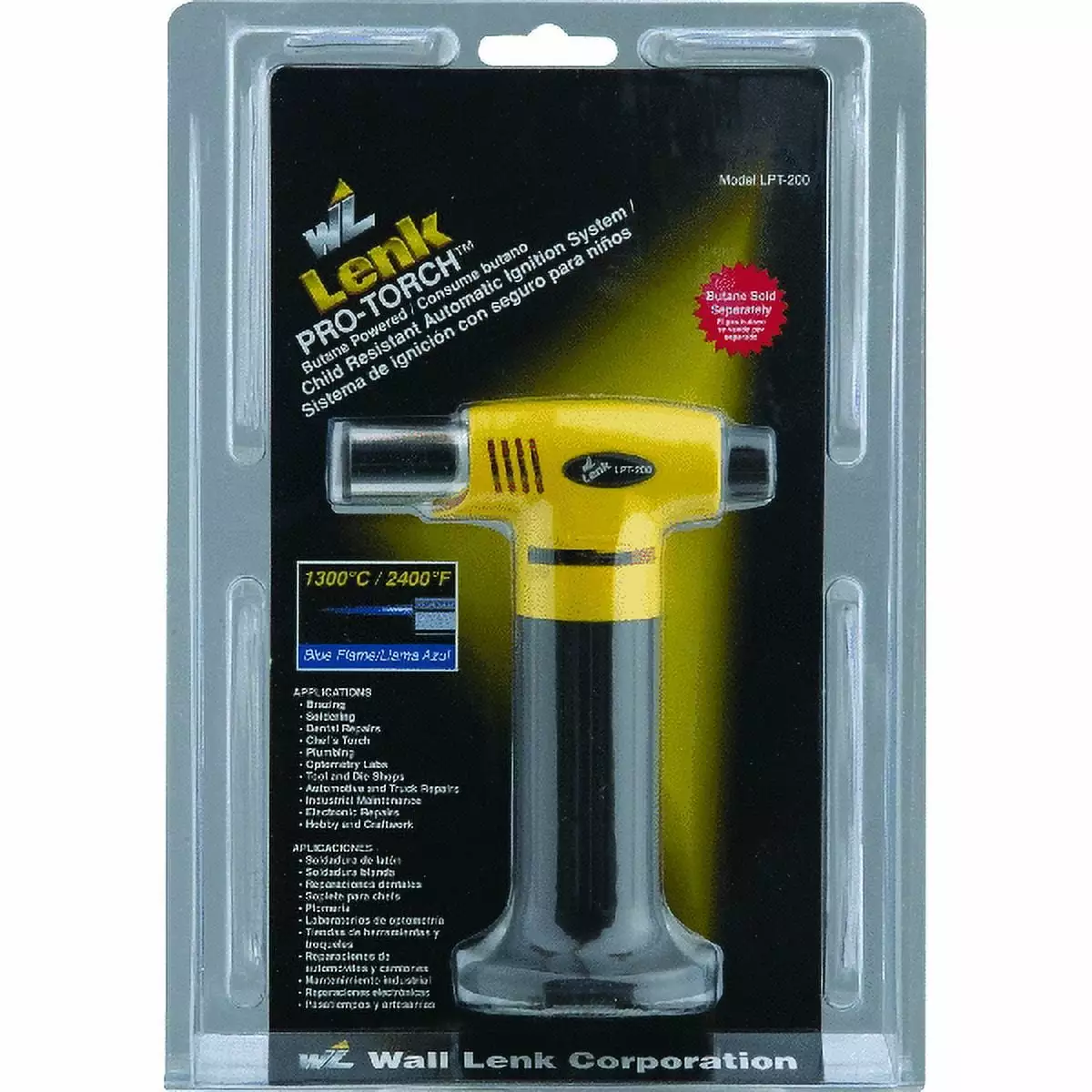 Lightweight butane powered butane torch features auto ignition and an adjustable high output flame. Sturdy construction for serious work in the shop. garage. lab. kitchen or on a job site. Flame temperature is adjustable to 2400 deg. F. with nonstop burning for up to 60 minutes on minimum setting. Butane sold separately. 5 year warranty.